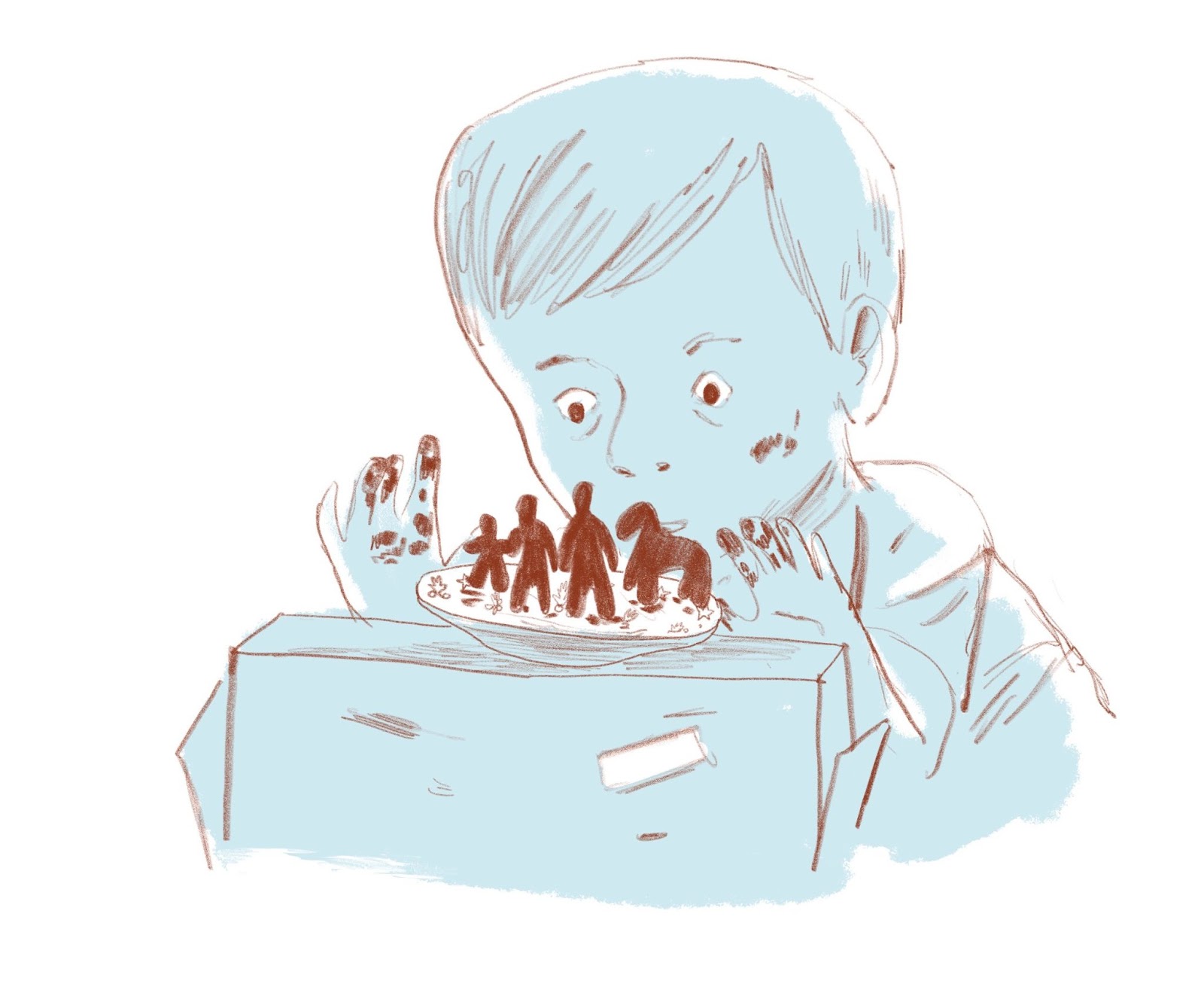 He played for hours. The next day, too, and the next. Maggie felt an unexpected and immense sense of relief to have his eyes off her. The next day he pestered Maggie to play with him and she magnanimously agreed to but when she sat down and picked up one of the brittle characters her hands shook and it broke. She felt so terrible she snapped at him that he needed to figure out how to entertain himself. Later inside, crying, she asked him to forgive her for being sharp with him. OK, he said, wide-eyed and anxious.